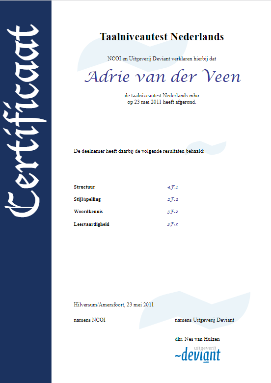 Certificaat taalniveau Nederlands, klik op afbeelding voor origineel