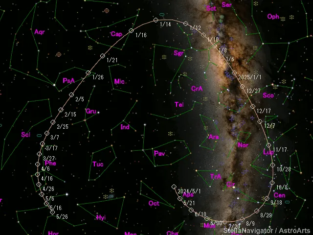 The path of Comet G3 ATLAS across constellations — primarily of the southern skies –is depicted by Japanese comet expert Seiichi Yoshida. (Image credit: Seiichi Yoshida)