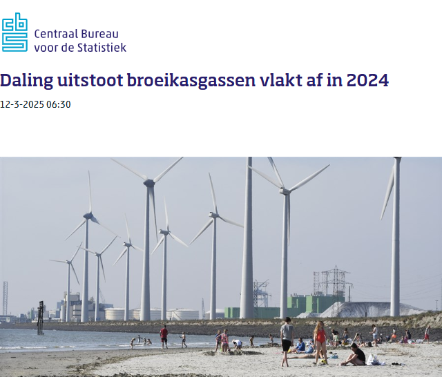 In 2024 was de uitstoot van broeikasgassen 1,6 procent lager dan in 2023, deze daling is kleiner dan in de twee voorgaande jaren toen de afname telkens ruim 7 procent bedroeg.