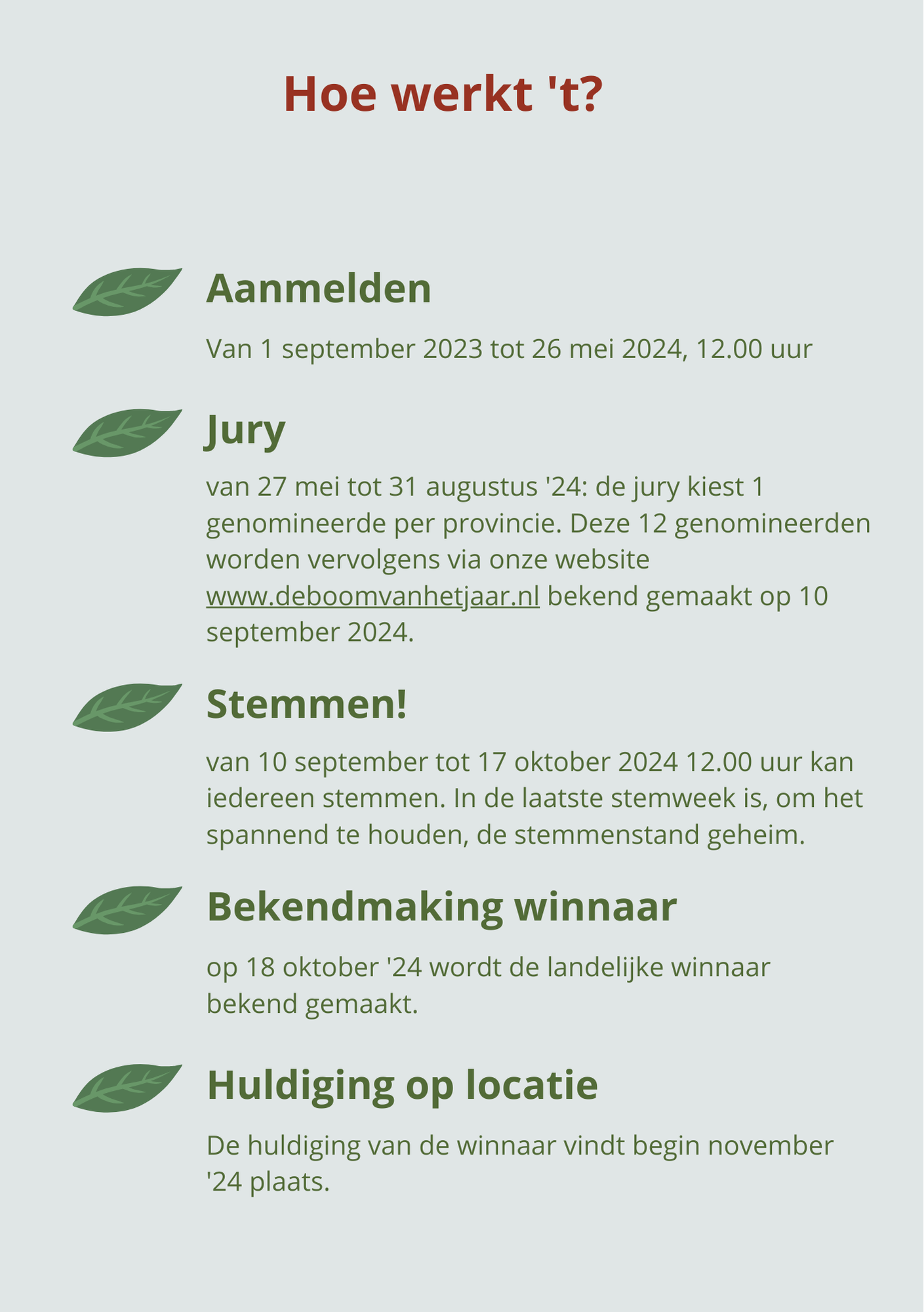 Of je nu dorpsbewoner, stadsgenoot of minister president bent, kleine of grote gemeente, bewonerscomité, trotse provincie of vrijwillige snoeiploeg: iedereen en elke organisatie kan een boom aanmelden voor de Boom van het Jaar verkiezing. Belangrijk is dat jouw boom een bijzonder verhaal, zoals een legende of een historisch verhaal heeft of op een bepaalde manier belangrijk is voor jouw gemeenschap. Uit alle provinciale en overzeese inzendingen kiest onze deskundige Bomenjury 13 (provinciale) winnaars. Dat is al reden voor een regionaal feest! In de nationale stemronde, waarin heel Nederland zijn stem kan uitbrengen, strijden deze 12 provinciale bomen om de landelijke titel “De Boom van het Jaar”. De verkiezing van de Boom van het Jaar, georganiseerd door SBNL Natuurfonds, richt zich op bomen met een bijzondere geschiedenis of maatschappelijk waarde binnen hun gemeenschap.