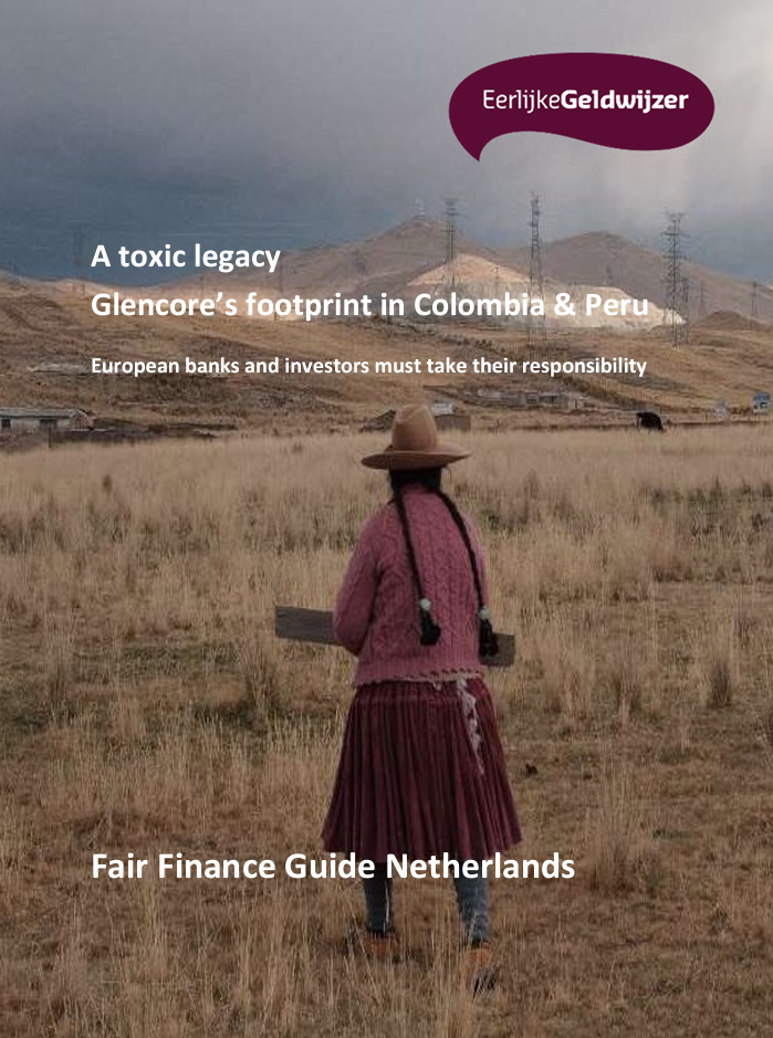 Rabobank, ING, pensioenfonds PMT, Allianz en Aegon blijven het omstreden mijnbouwbedrijf Glencore stevig financieren. Samen investeerden zij de afgelopen 6 jaar bijna 4 miljard in het bedrijf. Glencore ligt al langer onder vuur, zo zijn er verschillende klachten over milieuvervuiling en mensenrechtenschendingen bij Nationale contactpunten van de OESO ingediend en lopen er verschillende onderzoeken naar corruptie. Het onderzoeksrapport ‘A toxic legacy. Glencore’s footprint in Colombia and Peru’ van de Eerlijke Geldwijzer legt de verwoestende gevolgen voor mens en milieu bloot, veroorzaakt door Glencore mijnen in Colombia en Peru.