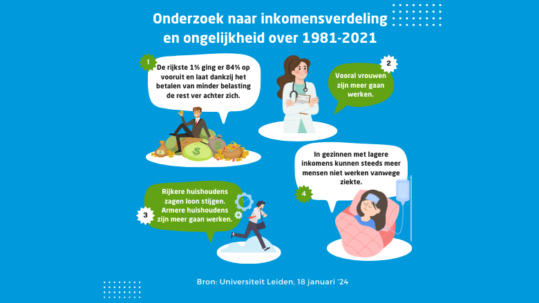 Achter de relatief stabiele inkomensongelijkheid in Nederland gaan grote veranderingen schuil. De inkomensongelijkheid is de afgelopen veertig jaar wel toegenomen maar viel vooral minder sterk uit doordat vrouwen in lagere inkomensgroepen meer zijn gaan werken. Ondertussen is het inkomen van mannen ongelijker geworden en is het de afgelopen veertig jaar maar weinig gegroeid. In de laagste inkomensgroepen is het inkomen zelfs afgenomen. Dat concluderen Egbert Jongen en Heike Vethaak van de Universiteit Leiden in een onderzoek dat zij uitvoerden in opdracht van de FNV. De ongelijkheid tussen inkomens nam tussen 1981 en 2021 met 12% toe, waarvan 5% in het laatste decennium. De ongelijkheid tussen de inkomens van mannen flink toegenomen, maar de ongelijkheid tussen die van vrouwen flink afgenomen. Dit laatste komt voor een belangrijk deel doordat vrouwen in de lagere inkomensgroepen meer zijn gaan werken. Opvallend is ook dat het besteedbaar inkomen van de top 1% juist het sterkst toenam, mede dankzij lastenverlichting in de laatste 10 jaar.