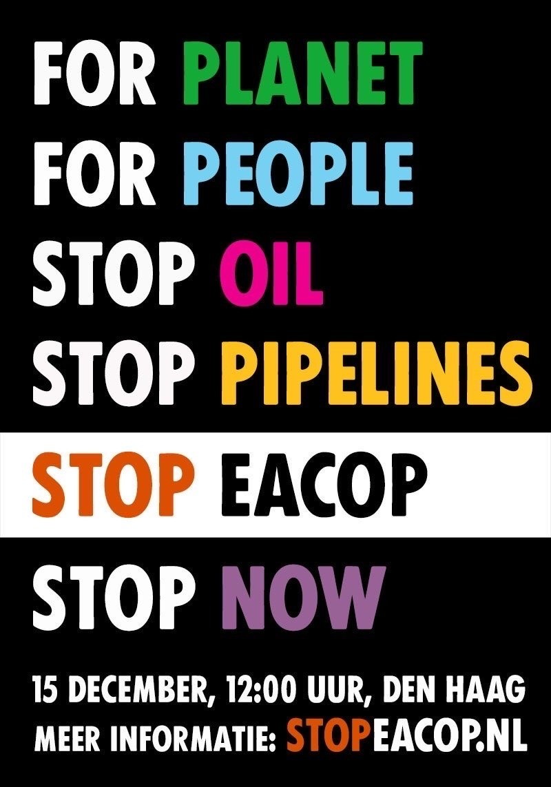 De tijd van nieuw fossiel is voorbij. De pijplijn, die olie gaat veDaarom voeren wij actie tegen EACOP en Total in solidariteit met de Justice Movement Uganda. En hebben we als derde eis: Total, help de veiligheid van activisten in Uganda en Tanzania garanderen.rvoeren door Uganda en Tanzania, zal goed zijn voor 34 miljoen ton CO2-uitstoot per jaar en heeft een grote kans op lekkages. Een ramp voor de planeet. En ook mensen lijden onder het megaproject. Terwijl Total zich verheugt op miljardenwinsten, worden er voor EACOP tienduizenden mensen geïntimideerd en van hun land verjaagd. Land dat voor de vele boeren daar in hun levensonderhoud voorziet. Wanneer klimaatactivisten in Uganda zich hier vreedzaam tegen verzetten, krijgen ze te maken met politiegeweld, marteling en opsluiting. Soms verdwijnen er mensen.
