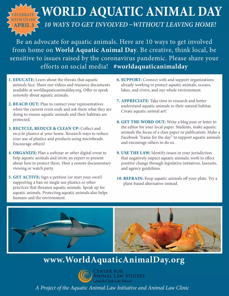 World Aquatic Animal Day is an annual day dedicated to aquatic animals. The event—launched for the first time on April 3, 2020—is a project of the Aquatic Animal Law Initiative and the Animal Law Clinic at the Center for Animal Law Studies.