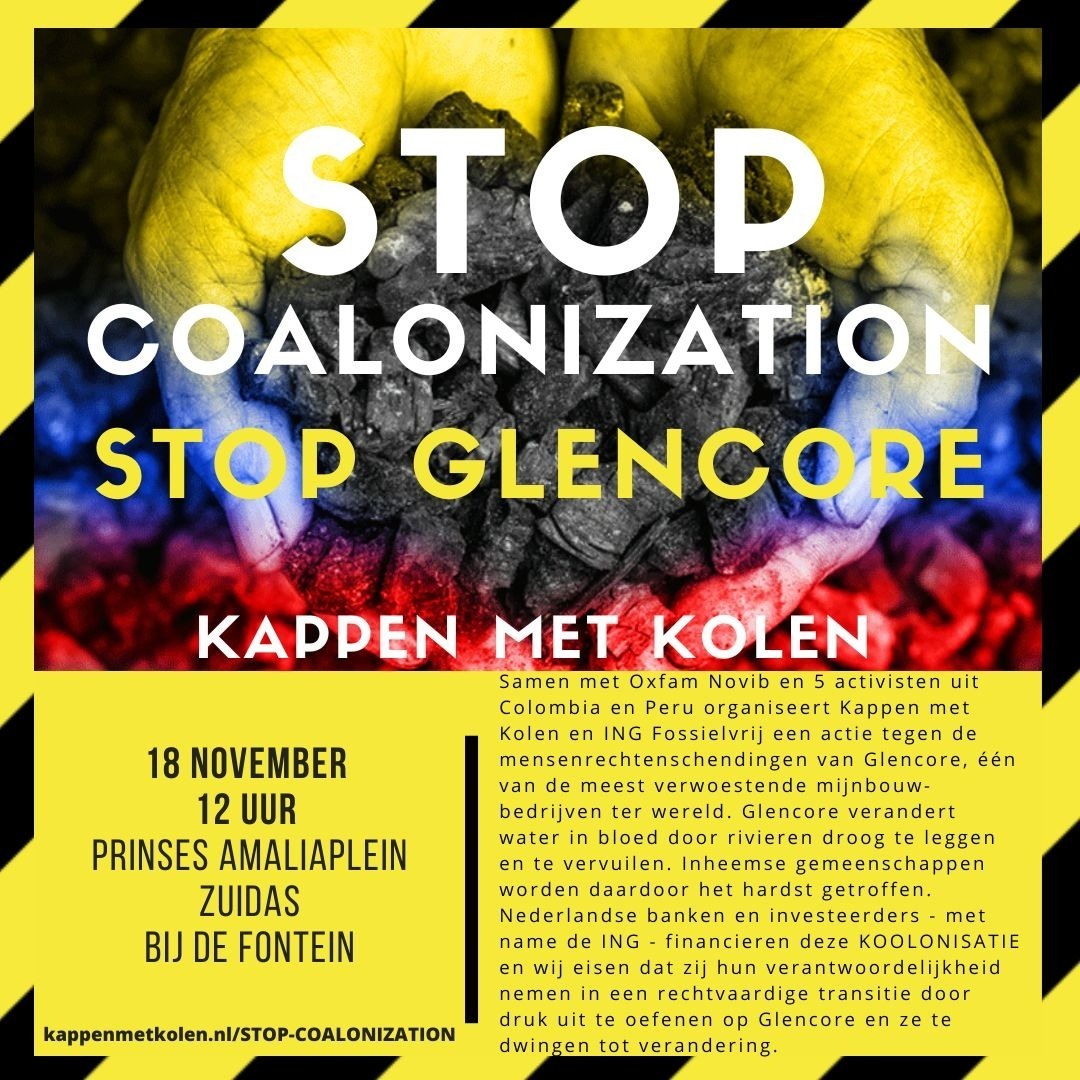 Zo is Glencore in Colombia onder meer verantwoordelijk voor het verleggen van rivieren en het vervuilen van drinkwater bij de kolenwinning. Inheemse gemeenschappen worden daardoor het hardst getroffen. Nederlandse banken en investeerders, waaronder ING, financieren deze KOOLONISATIE, en ook Nederlandse havens spelen een grote rol in de doorvoer van Colombiaanse kolen. Wij eisen dat Nederlandse banken als ING hun verantwoordelijkheid nemen in een rechtvaardige transitie door hun invloed op Glencore aan te wenden en ze te dwingen tot verandering. Ook eisen wij dat de invoer van kolen uit Colombia per direct wordt stopgezet totdat deze gegarandeerd bloedkolenvrij zijn. Dit is de derde actie die Kappen met kolen samen met activisten uit Colombia organiseert. In april hielden we in samenwerking met SOMO en PAX een actie tegen bloedkolen in de Amsterdamse haven, en in september vroegen we samen met FNV Mundial tijdens een A12-blokkade van Extinction Rebellion aandacht voor een rechtvaardige transitie. Als wij van kolen af willen, hebben wij een verantwoordelijkheid naar de mensen die in bijvoorbeeld Zuid-Amerika in de kolenketen werken, maar ook voor de schade die kolenwinning daar heeft aangericht – kolen waarmee we hier onze huizen verwarmen en onze industrie draaiende houden.