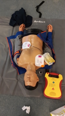 Een van de medische oefeningen was reanimatie met een AED, waarmee de pop meermalen geƫlektrocuteerd mocht worden.